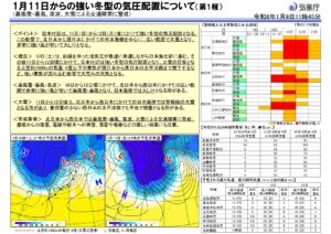 1月11日からの強い冬型の気圧配置についての気象庁発表を受け、国土交通省参事官より注意喚起が発出されておりますのでご案内いたします。気象庁発表の情報をご覧になる場合は下記画像をクリックしてご覧ください。