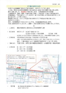 NEWSお知らせ 2026年4月17日 お知らせ 工事のお知らせ(県道157線、高松市朝日町) 既存の水道管を耐震管に取り替えるため下記日程において工事が実施されますのでご案内いたします。 工事名 高松市朝日町口径400mm配水管更新工事 工事期間 令和8年4月24日(金)~令和8年11月20日(金) 施工業者 株式会社カナック(電話 087-889-8114) 工事の流れならびに工事時間などの詳細については下記画像をクリックされ、ご確認ください。 前へ 一覧へ
